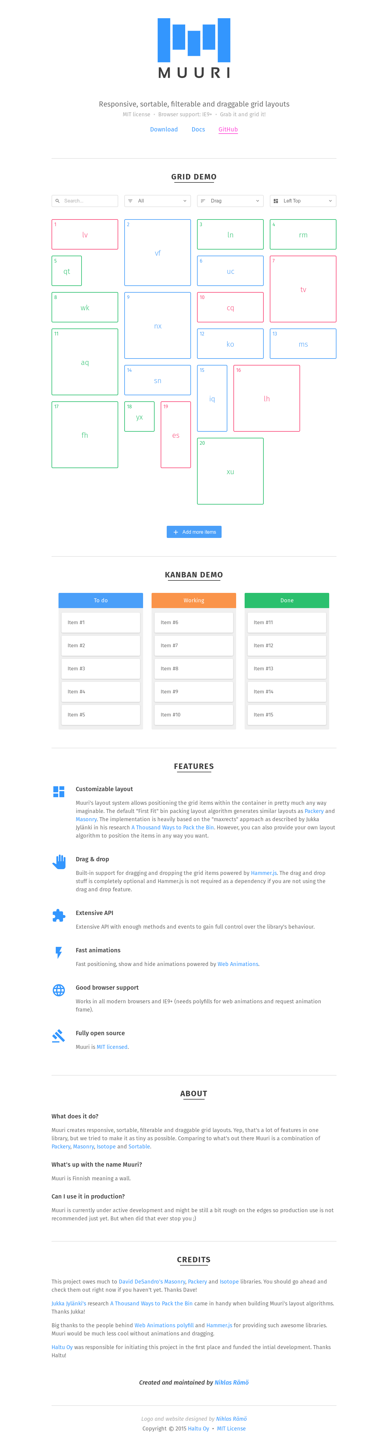 Muuri - Responsive, sortable, filterable and draggable grid layouts